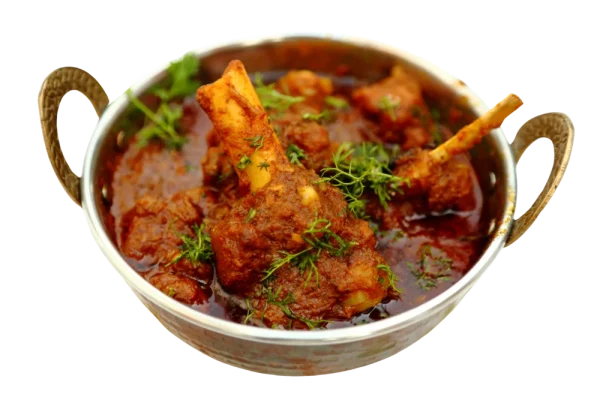 Slow cooked goat (bone-in) with onion, tomatoes, garlic, ginger and.